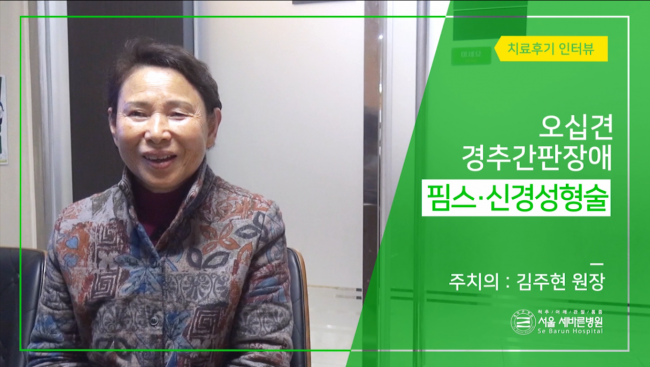 성함 : 이은숙 진단명 : 어깨 회전근개 파열 치료명 : 핌스(PIMS) 안녕하세요, 자기소개 부탁드립니다. – 안녕하세요, 저는 이은숙이라고 합니다. 세바른병원은 어떻게 알고 오셨어요? – TV프로그램에서 저하고 같은 증상의 환자가 핌스(PIMS)치료를 받고 나서 바로 호전돼서 바로 활동을 하는 것을 보고 병원을 검색하고, 원장님 확인하고. 그리고 나서 홈페이지에 들어와서 핌스(PIMS)치료가 뭔지 확인한 다음에 전화로 예약을…