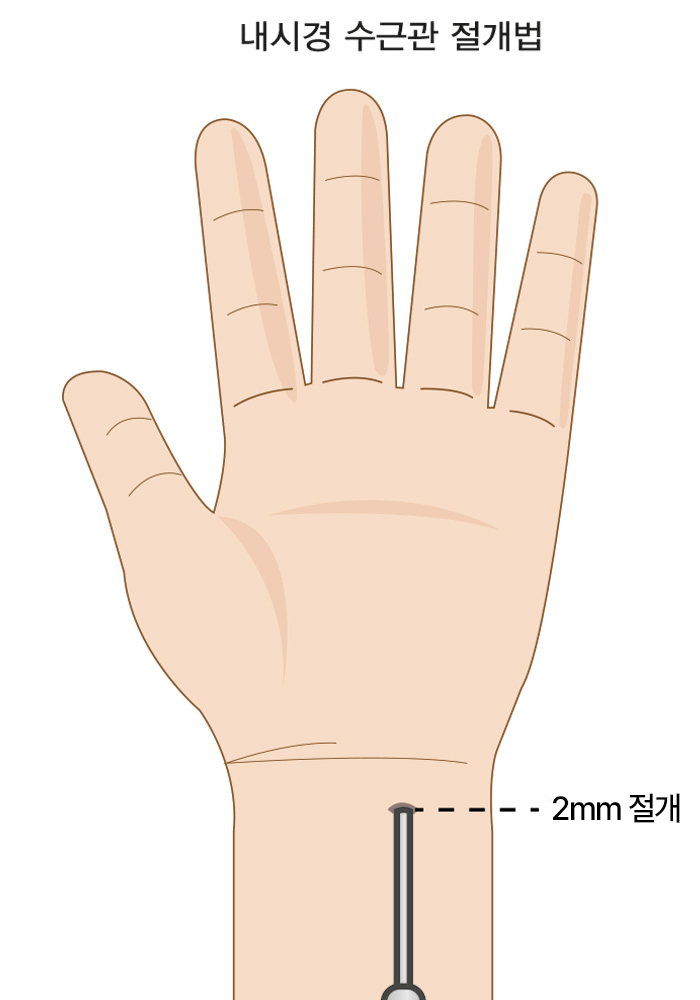 수술치료법은 상처부위를 직접 절개하여 치료하는 “개방적 절개법”과 손목 위쪽에서 피부 밑으로 손목터널까지 접근하여 횡수근인대만 선택적으로 절개하는 “내시경 절개법”이 있습니다.